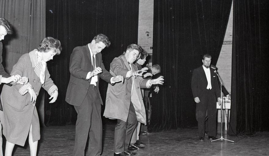 Caption: "International Hypnotist Janus Vroegryk had dozens out on the stage when he visited P.N. recently on a tour of the country. A packed house attended the Saturday Performance."
