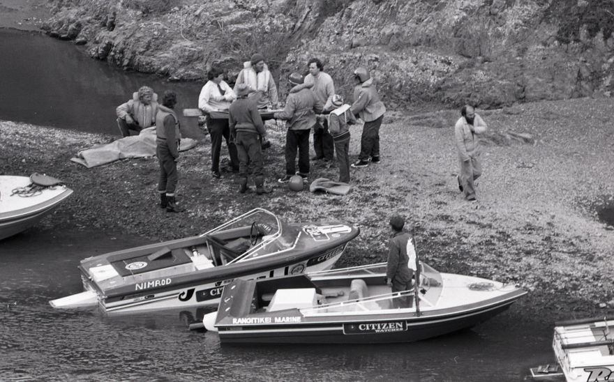 This series of images were taken for a story that ran in The Manawatu Evening Standard on 22 September, 1978. The article details a mid-river collision in the Manawatū Gorge during the Manawatū River stage of the 1978 CItizen Watch Jet Boat Marathon. The two boats that collided were Campbell Wilkie's "The Ugly" and Hilton McLachlan's "Ruffian" (with Ross Baker and Charles Hughes as crew). A third boat skippered by Bryan Harvey sustained damage whilst avoiding the collision. The photograph of P. Bayens' boat included in the article was not found with the negatives.