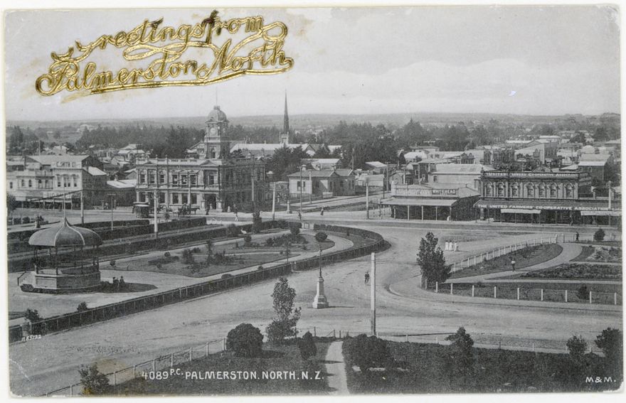 This postcard is of The Square - Main Street is shown running through the middle of the image. Prominent features of this postcard are the band rotunda and the old Post Office. The original, smaller, structure was built 1899 and moved to the Victoria Esplanade in 1907. This rotunda was built in 1907, but pulled down in 1956 to make way for the Hopwood Tower. The old Post Office (corner of Main Street East and The Square, now Highflyers Restaurant & Bar) was built in 1906 and was Palmerston North’s fourth, replacing the wooden structure that sat on the same site. This postcard is decorated with the words, "Greetings from Palmerston North".