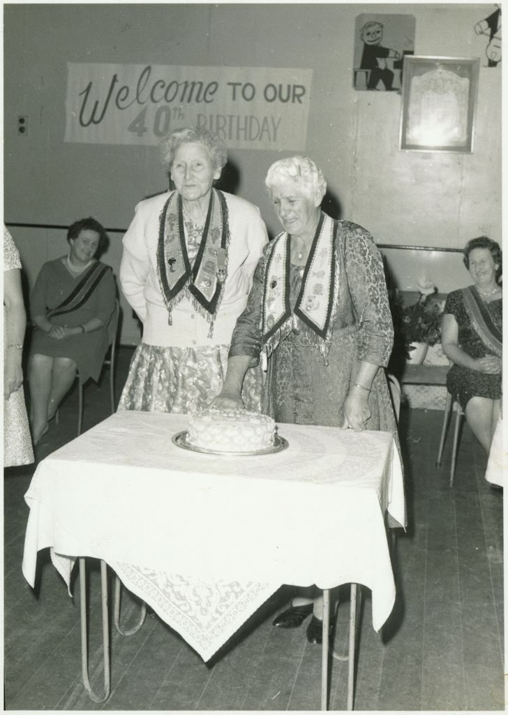 40th Birthday party of Hinekoa Rebekah Lodge. Standing left is Agnes "Aggie" Andrews who was in the lodge for over 40 years, spending 25 years as secretary. Mrs Andrews died in 1969. Standing right is Mrs Turner, sitting left is Colleen Drew and sitting right is thought to Evelyn Walton. The Hinekoa Rebekah lodge met in the Orient Hall in Church Street on Wednesday evenings.