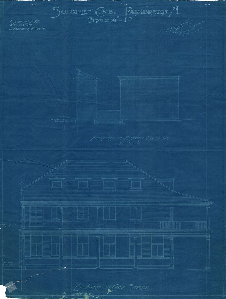 Elevation to George Street of the Soldiers' Club Building, dated 1916. Built on the corner of Cuba and George Streets for the Manawatu Patriotic Society and completed in 1917 to a design from the firm of L G West & Son. The building was used by the Returned and Services Association until 1966 when it was sold to a private owner. Currently it houses Cafe Cuba on the ground floor whose outdoor tables can be seen occupying the footpath along Cuba Street. The building is well preserved and contains many of the original design features including cast iron columns along the verandah.
