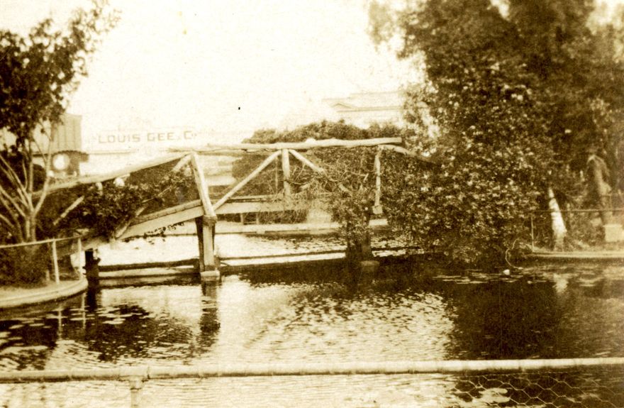 The lakelet was built in the Square, Palmerston North, in 1909. There have been four bridges across the lakelet. This, the first bridge, was in place from 1909 - 1958.