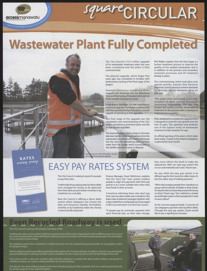 The Square Circular was Palmerston North City Council's monthly community publication, informing Palmerstonians of PNCC initiatives, activites, and events. This month's issue includes: wastewater treatment plant, easy pay rates, recycling roading, E waste, community consultation meetings, Manawatu Zonta exhibition, Memorial Park play equipment, interpreters, 10 year plan, council nursery, Plain English awards, Merv Hancock lecture, signage, Matheson Reserve, library summer reading programme, Te Manawa, New year's eve in the Square, Arena entrance.