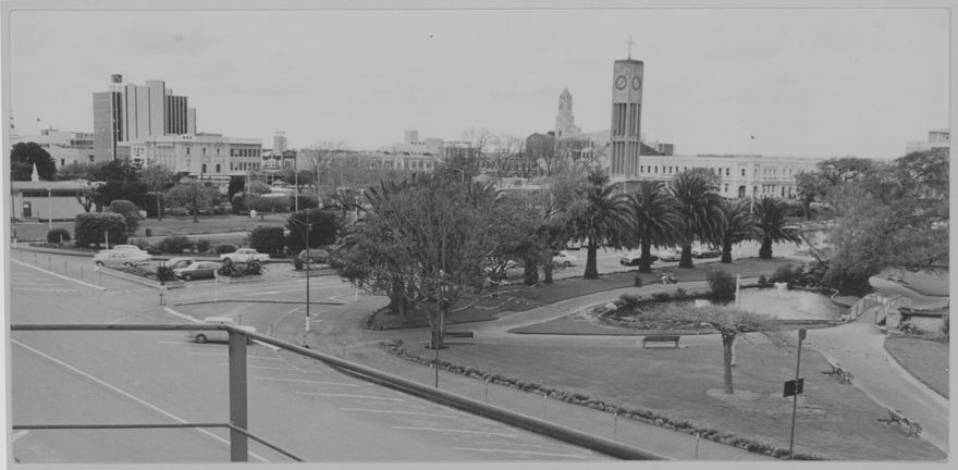 In the right foreground is The Lakelet - constructed in October 1909. It was the main feature of the last quadrant of The Square to be developed by the Beautifying Society. Directly behind The Lakelet is the old Post Office building (built 1904-1905)- it is shown here without its clock as they were removed from the Post Office tower when it was demolished after the earthquake of 1940. They were subsequently used for the Hopwood Clock Tower (left of Post Office). This clock tower was built in 1957 with a donation from Arthur Hopwood. It has experienced a number of changes including the removal of the original sound shell at the base of the tower (just visible in this photograph) in the early 1990s and the addition of a cross. During 2007 the Hopwood Clock Tower was refurbished and it is now topped with a lantern style cross. To the left of that is the TG (Australasian Temperance and General Mutual Life Assurance Society) Building, which was built in 1938.
