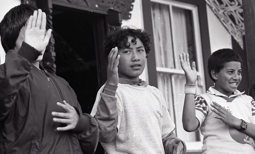 This photograph was taken for a story that ran in the Manawatu Evening Standard on 29 October 1985 about an extended visit made by Highbury residents to the Kauwhata Marae (Feilding). The families spent the week at the marae for an educational programme aimed at connecting them with their heritage, including lessons in te reo and learning about taha wairua (spiritual health). The people in the photograph are unidentified. To read the whole story, see Manawatu Evening Standard 29 October 1985.