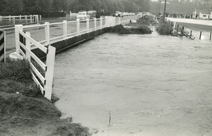 Turitea Stream in flood outside the entrance to Massey University on the left of the road and the Department of Scientific and Industrial Research (D.S.I.R)on the right.