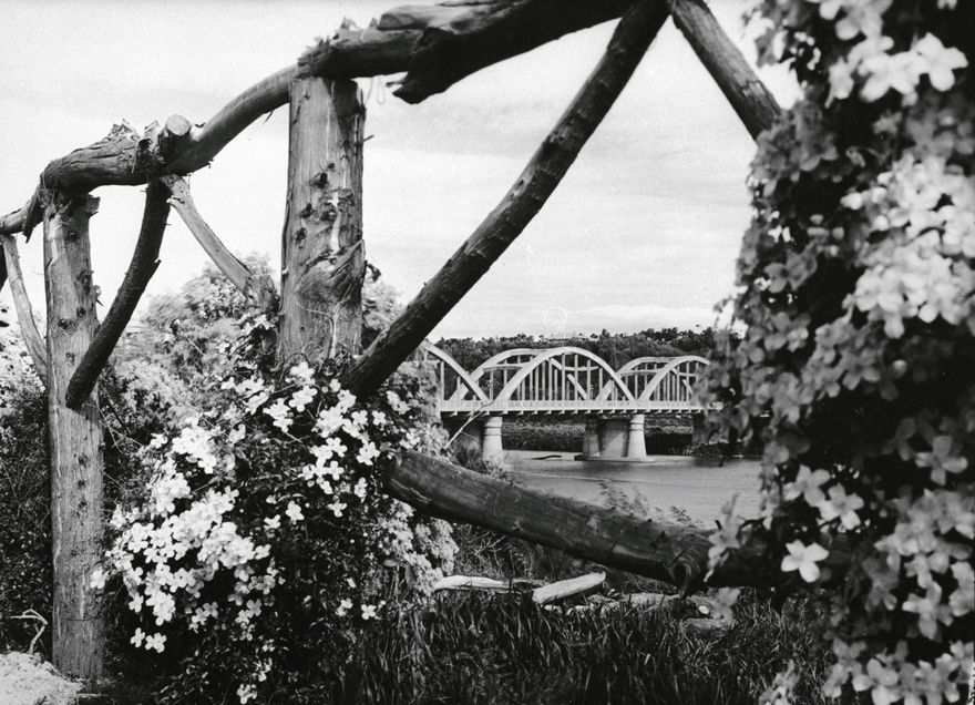 Shown here is a view of the Fitzherbert Bridge from the Esplanade Gardens. This bridge was built by Fletcher Construction Company Limited during 1933 – 1935 at a cost of £34, 074. The bridge was officially opened by Viscount Galway the Governor General on the 20th of July 1935. In the foreground is the pergola, built c1916-1917 and demolished c1940.