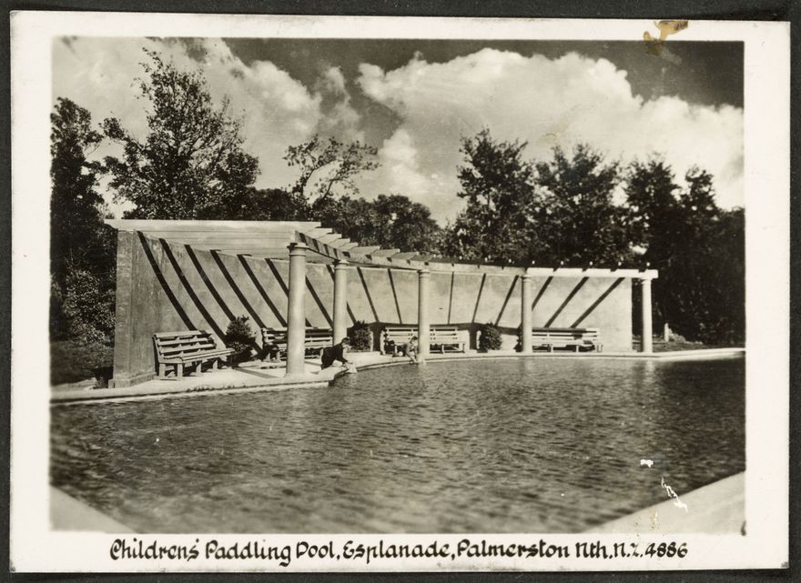 A view of the Children's paddling pool, donated by the RSA and built in the 1930s. One of a set of images of Palmerston North, produced for sale.