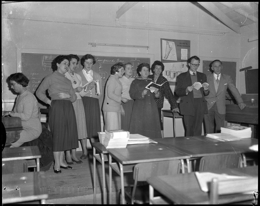 This image was taken for a story that ran in The Manawatu Evening Standard on 1 August, 1959. "The chorus for the presentation of the "Barber of Seville" being trained by Mr T. Staples for the Palmerston North performace by the New Zealand Opera Company and the National Orchestra in the Opera House this month. From the left are: Miss M. McKenzie, Miss G. Millar, Miss R. Littlejohn, Mrs V. Sinclair, Mrs B. Jolly, Mrs P. Bellchambers, Mrs N. Dickson, Mr R. Duxfield and Mr G. Sutherland."