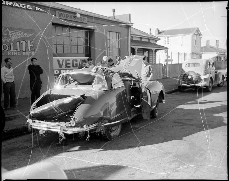 This image was taken for a story that ran in The Manawatu Evening Standard on 03 July 1961 "A local motorist has a fortunate escape from serious injury on Saturday night when the car he was driving rolled over. Only by throwing himself on to the floorboards did he escape. On Sunday many bystanders gazed at the extensive damage done to the car."
