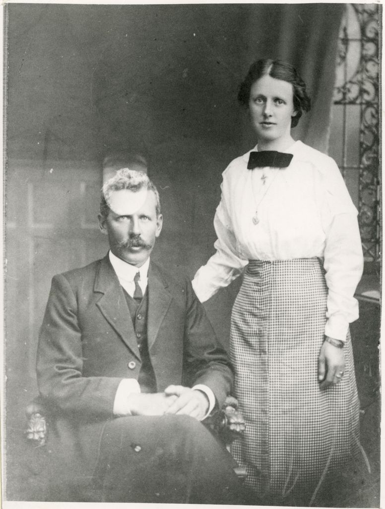 Mr Stan Hunt was the eldest son of Herbert Hill Hunt (Manawatu County Councillor for 22 years, from 1910). The woman in the photograph is Marion Tennant (nee Smith). They married in Whanganui in August 1912. They farmed on the north-west corner of Tompkins and Milner Lines, which was originally his father's property. They had five children - Herbert, Charles, Phyllis, John Tennant and Ivan.
