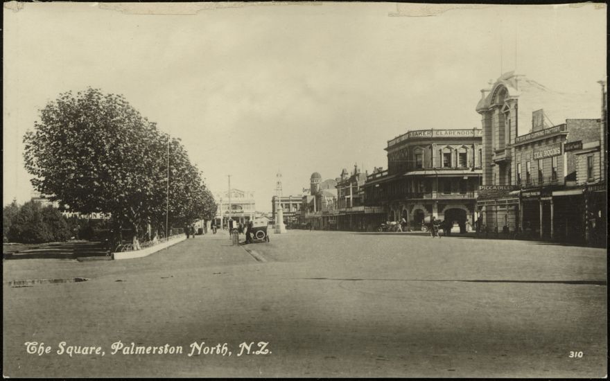 This postcard looks from Broad Street (now Broadway Avenue) through The Square towards Coleman Place (now Coleman Mall). In the foreground, on the corners of Rangitikei Street and The Square, are the Piccadilly Tea Rooms and the Clarendon Hotel.
