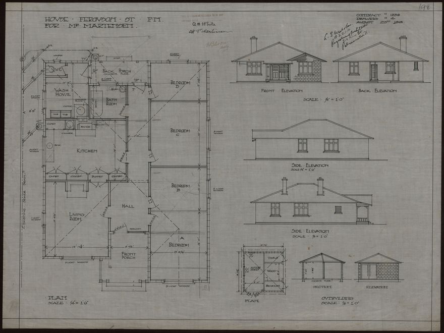 These plans for a single-storey, four bedroom residence were designed by L. G. West and Son for Mr Martensen. The Danish-born architect Ludolph Georg West (1846-1919) established an architectural practice in Palmerston North in about 1880. In 1912 he formed a partnership with his son, Ernest Vilhem West, who continued the business after his father's death.