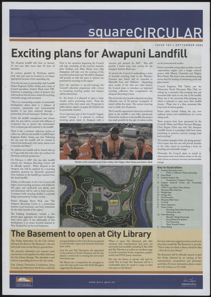 The Square Circular was Palmerston North City Council's monthly community publication, informing Palmerstonians of PNCC initiatives, activites, and events. This month's issue includes: maintenance hotline; Awapuni landfill; library; Abbeyfield; Local Initiatives Fund; Cultural Heritage Incentive Fund; recreation ticket; Kelvin Grove cemetery gazebo; traffic lights; street cleaning machinery; Kawau stream restoration; civil defence; Mark Themann.