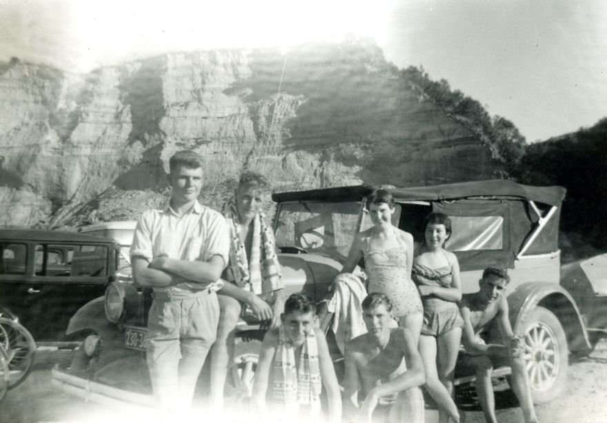 A group of friends on a swimming excursion to the Manawatu River, accessed from the end of Albert Street, Palmerston North. From left: Matt Moody; Tom Bainbridge; Ross Greatorex (seated); Dave Greatorex (seated); Margaret Greatorex (later Hansen); Patricia Hayes (later Eaton); Pete Hansen. Also can be seen, David Greatorex’s car.