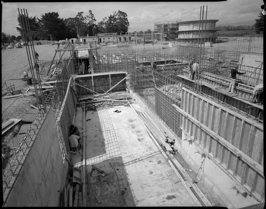The sewerage treatment plant beside the Manawatu River opened in 1968, replacing the septic tank and filter beds which had been in use since 1905. Some images from this collection have been digitised from prints housed in other archival collections. This image is from an original negative.
