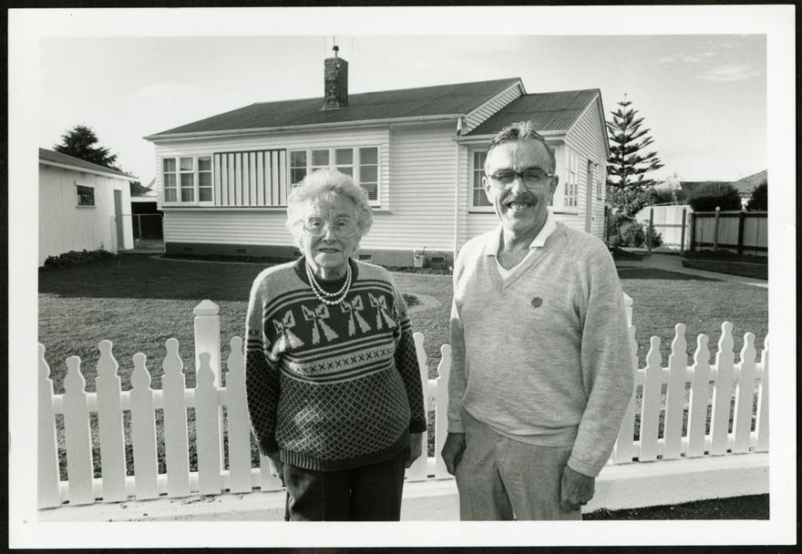 Betty Evans (c1908-1994) and John Hamilton (Ronnie) Evans (c1937-2002), outside 5 Mansford Place. Betty Evans lived at 5 Mansford Place from the 1940s until 1992. She married Jack Evans in 1936 and they were early and long term residents of the Savage Crescent state housing precinct.