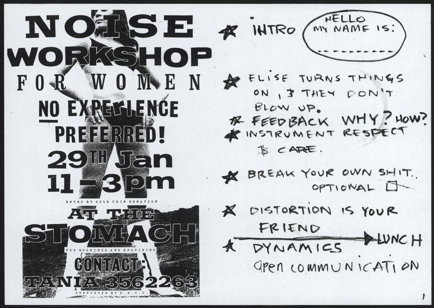 Noise Workshop for Women. No experience preferred! 29th Jan 11-3pm at the Stomach. Contact Tania 3562263. Intro hello my name is...Elise turns things on and they don't blow up. Feedback why? how? Instrument respect and care. Break your own shit, optional. Distortion is your friend. Lunch. Dynamics. Open communication.