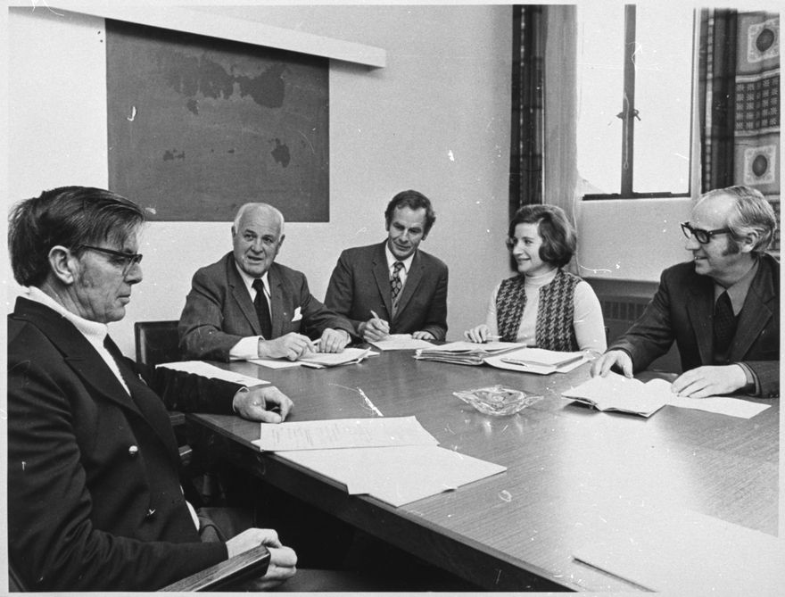 Councillors at the meeting from left: M K M Wynks; Gordon A Brown (Chairman); Bernard J Forde; Joyce M Dunmore; J B Booth.