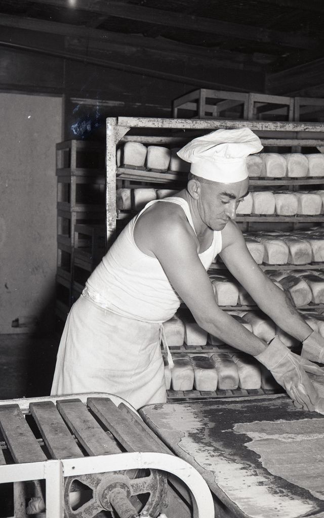 This image was taken by Frank Goldingham for Photorama pictorial magazine. Although it was housed with the April negatives, it was not published until the June edition in 1963. "Bob Forrest taking baked bread from conveyor belt and placing in crates ready for despatch."