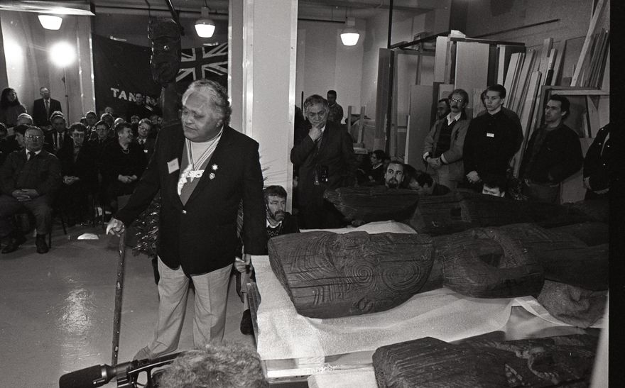 This image was taken (but not used) for a story that ran in The Manawatu Evening Standard on 4th August 1993. "The air was thick with emotion when four Rangitāne pouwhenua (carved stockade posts) were returned home yesterday after an absence of 60 years. Originally from Puketotara Pa, the pouwhenua were considered significant and important taonga for the Rangitāne people. They were the only large Rangitāne carvings still in New Zealand, and four of seven in existence. In 1933, Wiremu Kingi Te Awe Awe presented the carvings to the then Dominion Museum for safekeeping. There they were displayed in the Māori Hall for many years. Today, a delegation from the Museum of New Zealand, Te Papa Tongarewa, led by board chairman Sir Hamish Hay and Māori art and history director Cliff Whiting, handed over the carvings on a permanent loan basis to the Manawatu Museum. They will form a major component of the exhibitions in the new Manawatu Museum - Science Centre, opening in February next year. Mr. Whiting said the decision to return the carvings to their area of origin was part of the New Zealand Museum's policy of partnership with other museums. [Pictured] One of the four Rangitāne pouwhenua, returned to the Manawatu yesterday, is unveiled in preparation for transportation to a wing of the Museum's new premises."