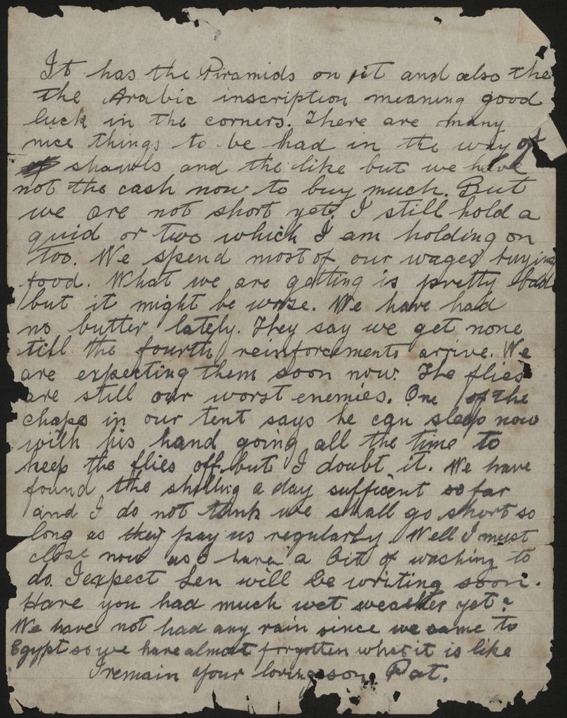 This letter from Pat to his parents is from Zeitoun Camp near Cairo in Egypt. Len and Pat both died at Chunuk Bair in 1915.