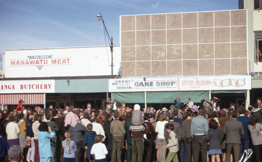 A crowd is watching a parade or procession (possibly for the Ranfurly Shield) on the Church Street side of the Square. Manawatu Meat, Ideal Cake Shop and Pram House for Toys shops can be seen in the background.