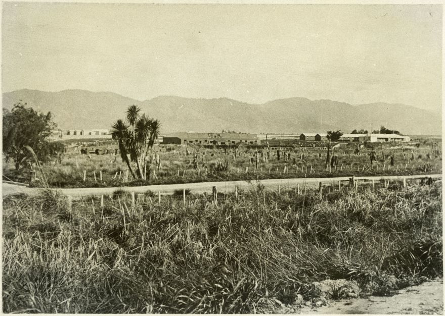 Miranui Flaxmill was owned by A & L Seifert Flaxmilling Company Ltd and opened in 1907. This view is taken from the railway, looking east towards the Tararua Ranges. The scutching shed is the white building on the left in the background; the shipping shed is the gabled building in the middle distance, and the sleeping quarters are on the right in the background. The road in the foreground is the main Shannon-Tokomaru road. Note the locomotive in the left middle distance.