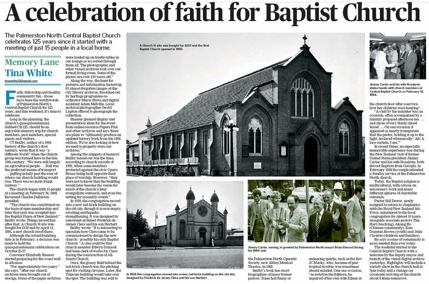 Journalist Tina White's weekly "Memory Lane" article in the Manawatū Standard. The Central Baptist Church celebrates its quasquicentennial, 125 years since it started. The article includes highlights from its history, historical details of church people and the buildings which have stood on the site purchased in 1895.
