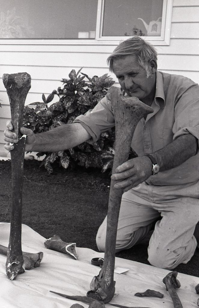 This series of images were taken for a story that ran in The Manawatu Evening Standard on 29 April, 1982. “A well-preserved set of moa bones found on a Levin farm this week will have to be identified by an expert. The bones – a foot and a leg from a large bird and bones from a smaller bird – were found during clearing of a drain 1.5 metres deep on Mr Collis Blake’s farm at Ihakara, north of Levin. R Lou Gurr (left), a former reader in zoology at Massey University, said the large bones definitely came from the “big moa” but the species still had to be identified. He said the bird could have been as tall as 3.5 metres. Mr Blake’s grandfather found a similar set of bones in 1916 in Wairarapa.”