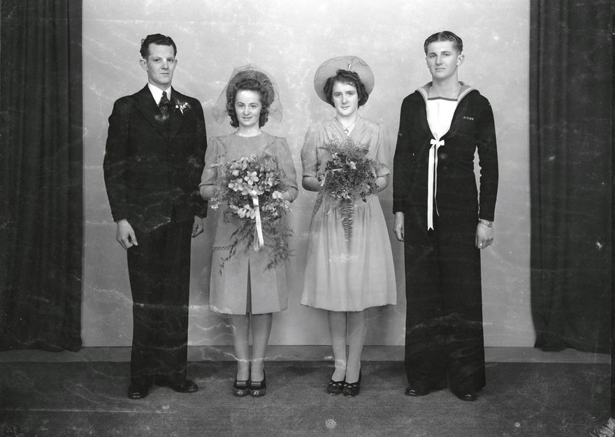 Wedding party of bride and grrom, bridesmaid and a naval rating as presumed best man.