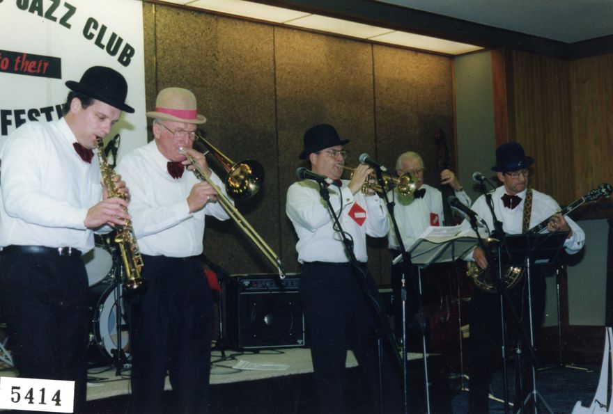 Riverside Jazz Band performing at the 25th Annual Manawatū Jazz Festival. L-R: Graydon Crawford (soprano saxophone) Don Crawford (trombone) Noel Watts (leader/trumpet) Colin Hopley (bass) Ray Woodley (banjo)