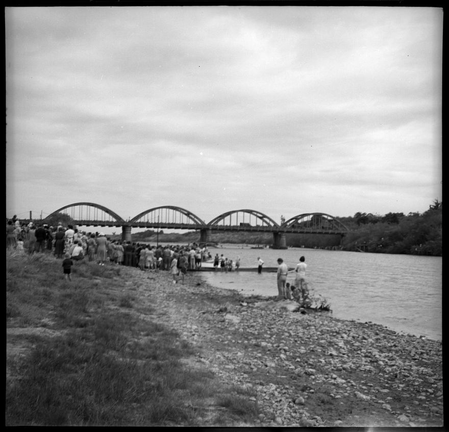 The celebrate the 75th Anniversary of Palmerston North, a programme of events was held from 15 to 22 March 1952. The opening event, on the morning on Saturday 15th, was a reenactment of the "arrival of the first White Women and children by Canoe at Fitzherbert Bridge." The crowd in this photograph are believed to be watching this event.