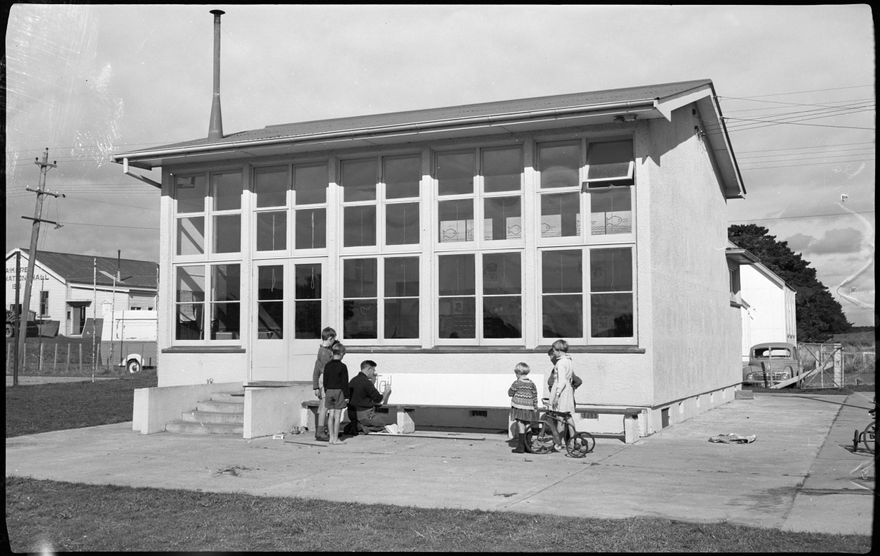 This image was taken for a story that ran in The Manawatu Evening Standard on 16 May 1958, page 11: "A new section of the Taikorea School with the headmaster (Mr. A. Hanna) preparing a sign for use at the jubilee functions which open tomorrow."