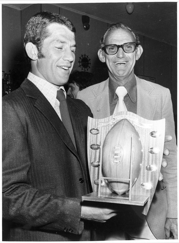 Mr 'Lofty' McIntosh of the Manawatu Supporters Club present the Manawatu footballer Kevin Eveleigh with the trophy for the most consistent player of the year.