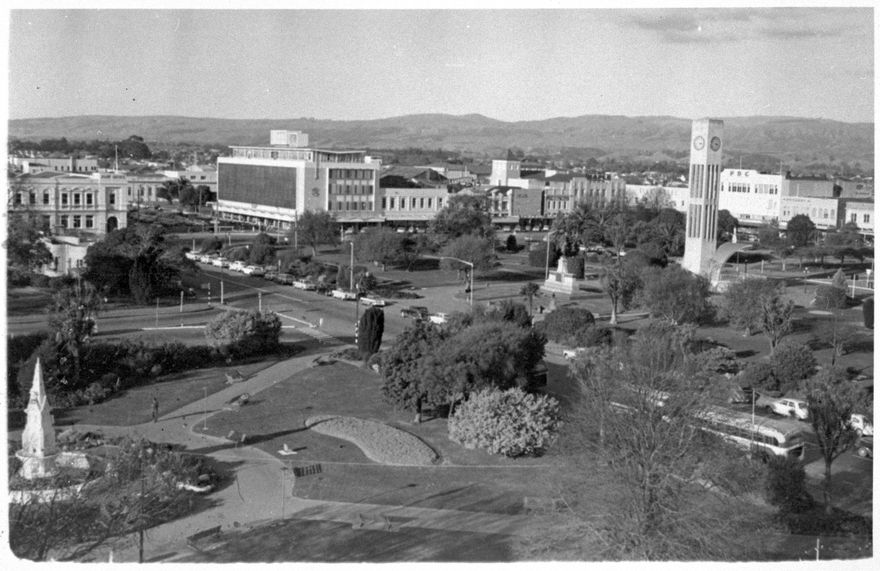 Looking across the Square, probably from the DIC building. The old Post Office is on the left of the photograph and the library building is opposite it. The library moved to its current home in the old CM Ross building in 1996. The old library building is now the Square Centre - housing office space and a cafe. The King Edward Memorial is on the left side of the photo. It has since been moved to the quadrant of the Square closest to Broadway Avenue. The Hopwood Clock Tower is also visible. It has undergone a number of changes including the removal of the original sound shell at the base of the tower (just visible in this photograph) in the early 1990s and the addition of a cross. During 2007 the Hopwood Clock Tower was refurbished and it is now topped with a lantern style cross. The War Memorial can be seen in front of it.