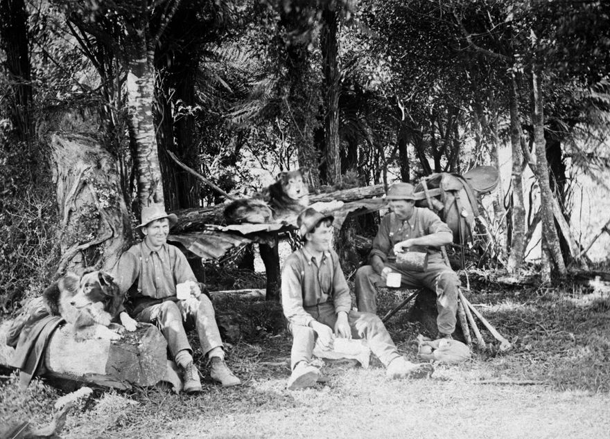 The Dittmer brothers and their dogs take a break in front of a rough shelter. There were four brothers, Herman, John, Henry and William, it is unclear which are pictured here. The brothers farmed, with their father Henry, on Scott's Road, Kahuterawa, c 1904-1920, also known as Hill Top Road and Motu Rimu. When the land was bought in 1904 it had to be cleared and a sawmill was established to process the timber. They farmed cattle and sheep