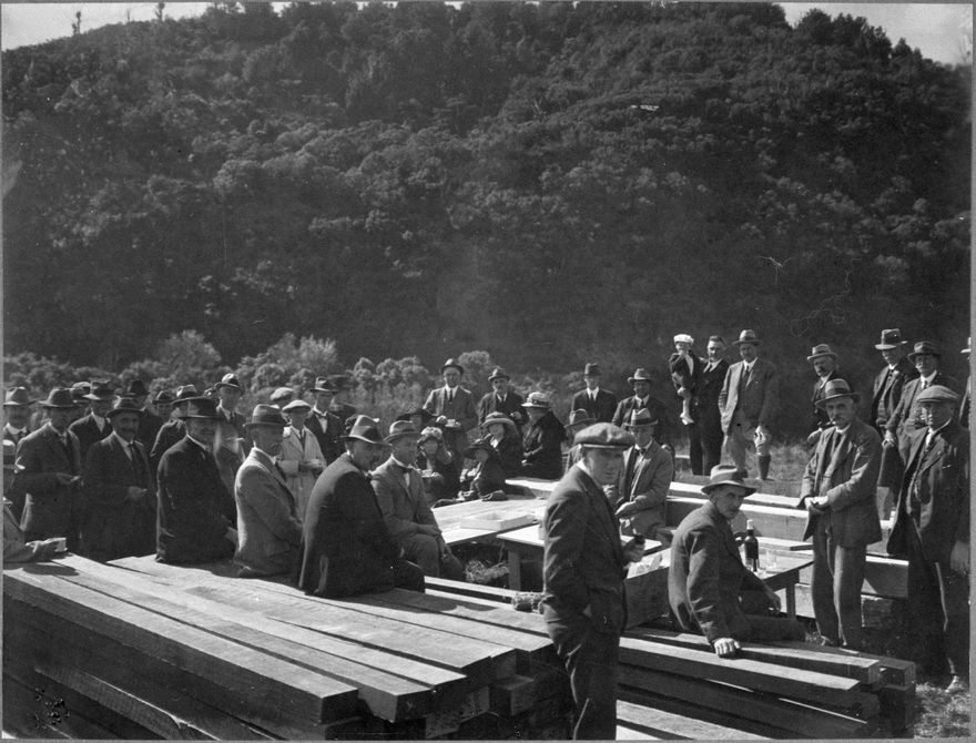 This function was conducted by the Manawatu Gorge Board of Control to celebrate the widening and straightening of the Gorge road. Mr J A Nash is standing at rear, holding child, and J G Coates, Minister of Public Works, is standing on Nash’s left.