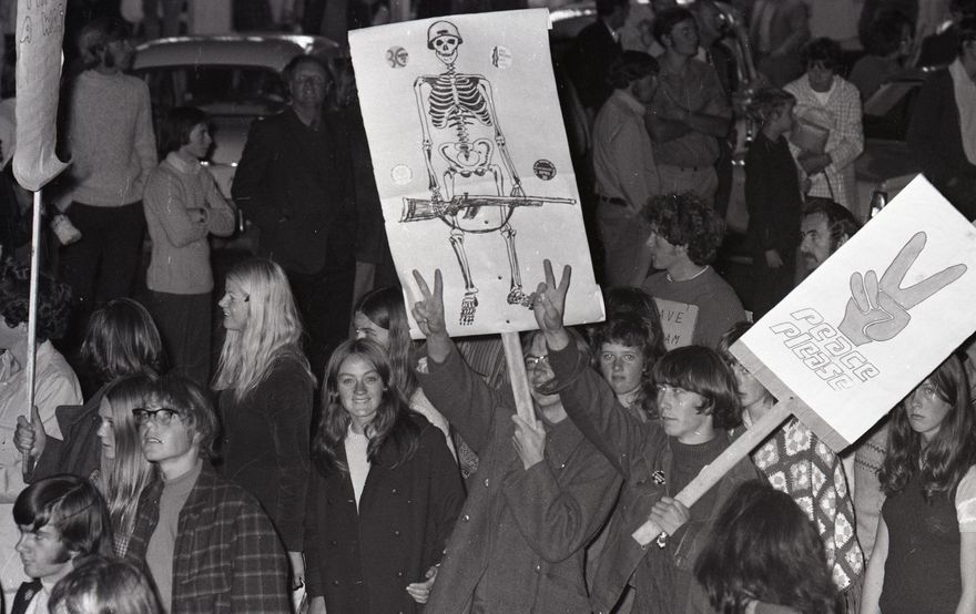 This image was taken (but not used) for a story that ran in The Manawatu Evening Standard on the 1st of May 1970. "Two thousand people sat and stood in front of the Palmerston North Clock Tower last night and sang “We Shall Live in Peace” as the climax to probably the biggest protest march held in Palmerston North.”