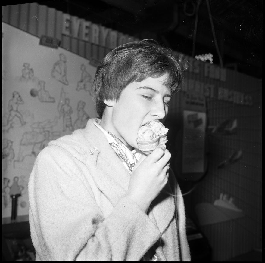 This image was taken for a story that ran in The Manawatu Evening Standard on 10 May 1961 ""The Fair was alright I suppose" according to J. Welleans who appears to be enjoying one of the latest types of ice-cream which is sold there."