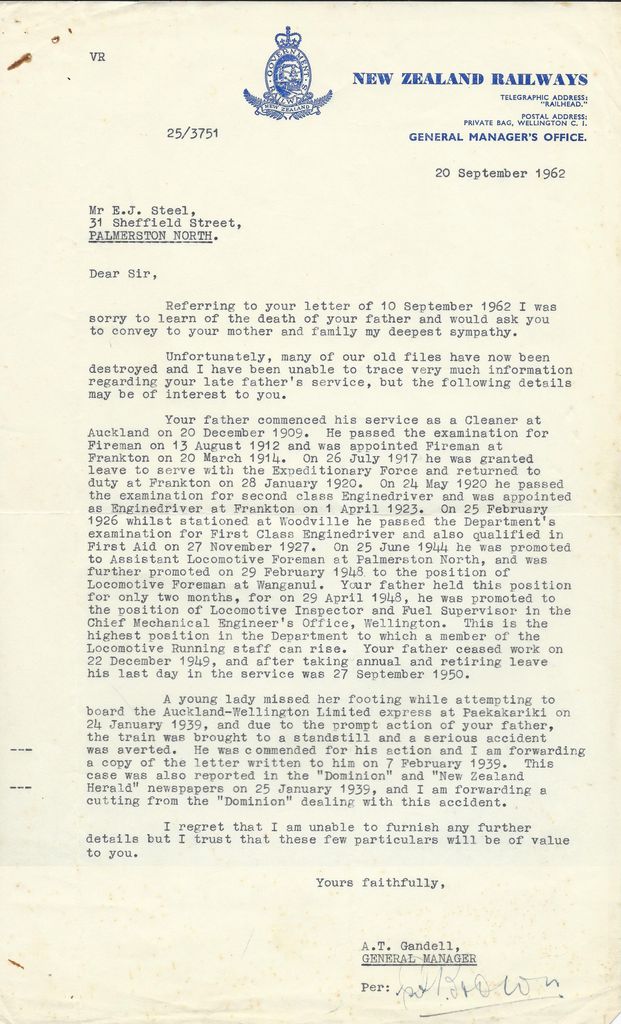 A letter regarding the service information of John Alfred Steel in the New Zealand Railways.