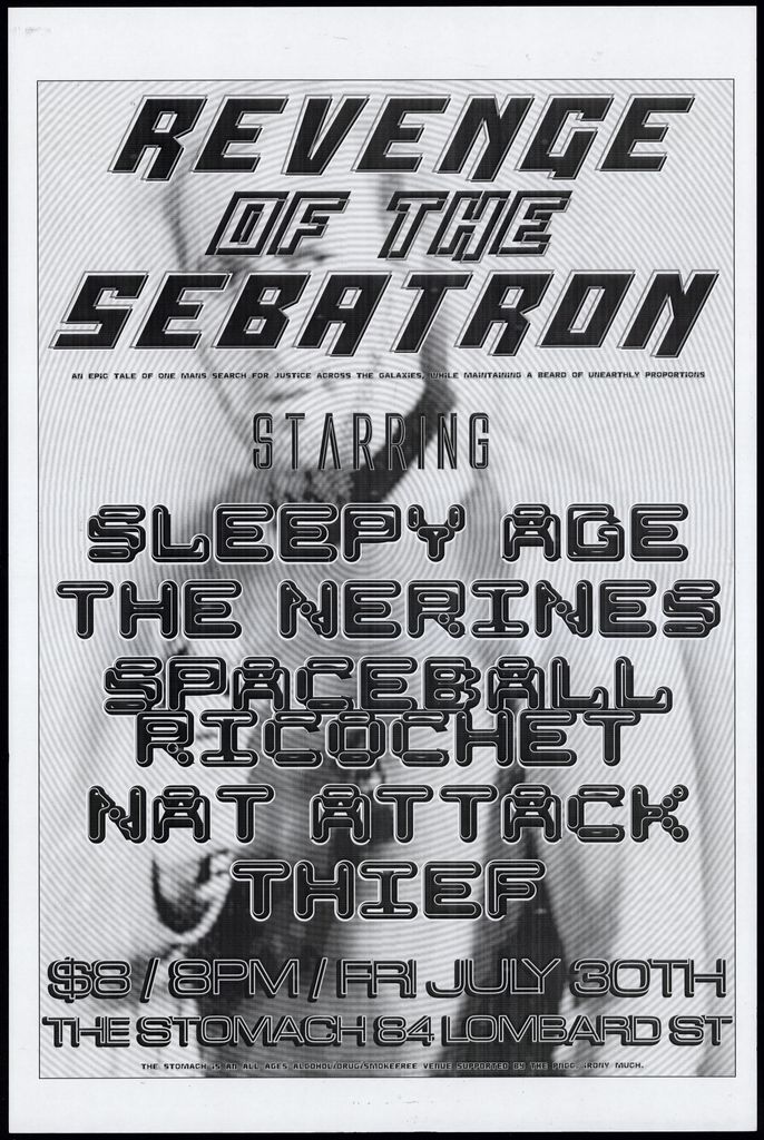Revenge of the Sebatron. Starring Sleepy Age, The Nerines, Spaceball Ricochet, Nat Attack, Thief. $8/8pm/Fri July 30th. The Stomach 84 Lombard Street. The Stomach is an all ages alcohol/drug/smokefree venue supported by the PNCC. Part of a collection of posters that were displayed at The Stomach, Lombard Street, venue for Creative Sounds Society Incorporated.