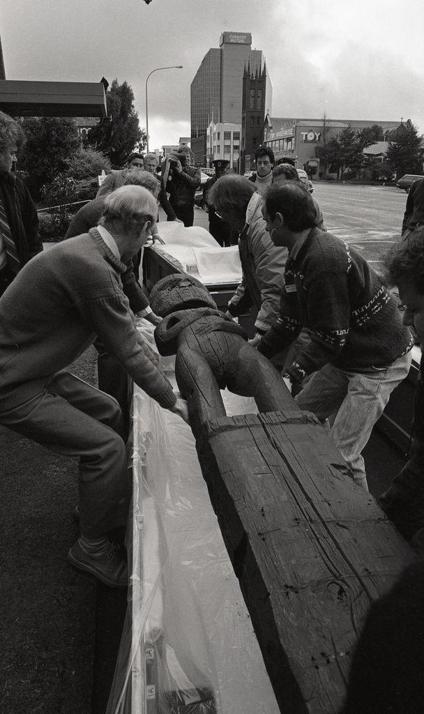 This image was taken (but not used) for a story that ran in The Manawatu Evening Standard on 4th August 1993. "The air was thick with emotion when four Rangitāne pouwhenua (carved stockade posts) were returned home yesterday after an absence of 60 years. Originally from Puketotara Pa, the pouwhenua were considered significant and important taonga for the Rangitāne people. They were the only large Rangitāne carvings still in New Zealand, and four of seven in existence. In 1933, Wiremu Kingi Te Awe Awe presented the carvings to the then Dominion Museum for safekeeping. There they were displayed in the Māori Hall for many years. Today, a delegation from the Museum of New Zealand, Te Papa Tongarewa, led by board chairman Sir Hamish Hay and Māori art and history director Cliff Whiting, handed over the carvings on a permanent loan basis to the Manawatu Museum. They will form a major component of the exhibitions in the new Manawatu Museum - Science Centre, opening in February next year. Mr. Whiting said the decision to return the carvings to their area of origin was part of the New Zealand Museum's policy of partnership with other museums. [Pictured] One of the four Rangitāne pouwhenua, returned to the Manawatu yesterday, is unveiled in preparation for transportation to a wing of the Museum's new premises."
