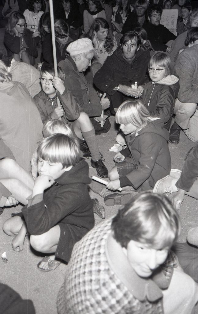This image was taken (but not used) for a story that ran in The Manawatu Evening Standard on the 1st of May 1970. "Two thousand people sat and stood in front of the Palmerston North Clock Tower last night and sang “We Shall Live in Peace” as the climax to probably the biggest protest march held in Palmerston North.”