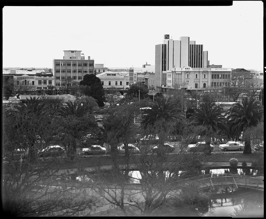 This photograph of The Square was taken in the vicinity of the Manawatu Standard building. In the foreground is the Lakelet (or Butterfly Lake), followed by the Phoenix Palms that once lived in The Square. The tall building to the right is the The Commercial Union Building, situated on the corner of Rangitikei and King Streets. It was completed in March 1973. In front of this is the former Bank of New Zealand. It was demolished for a new multi-storey BNZ. to the other side of the Rangitikei Street corner can be seen the multi-storey MCL building.