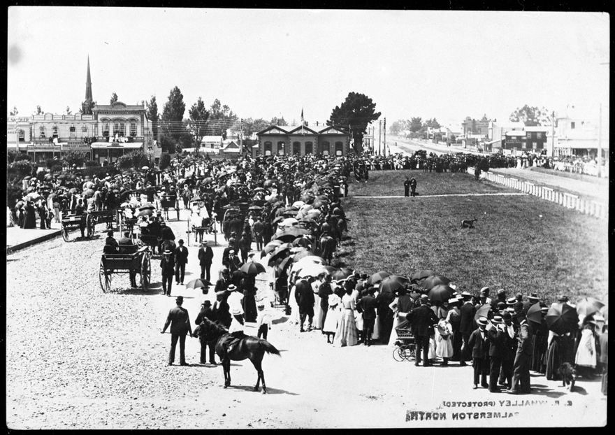 The Indian troops of the British Imperial Army toured New Zealand and visited Palmerston North for a short time. The train stopped in the centre of the Square, the troops disembarked, performed some displays and them re-embarked on the train. For an account of their reception, see Manawatu Times, Volume XXVI, Issue 7172, 25 February 1901, Page 2 (available online at paperspast.natlib.govt.nz)