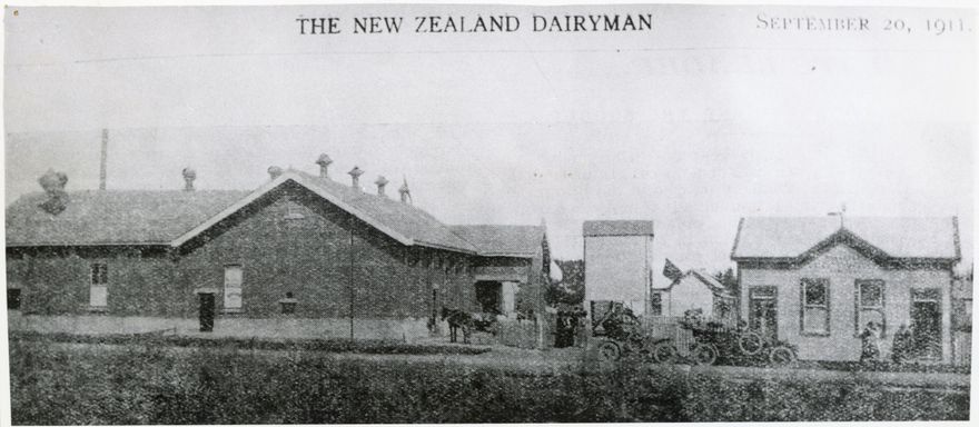 The Rongotea Co-operative Dairy Co. Ltd was founded 1895. The brick building is the new dairy factory, built in 1911, the third in Rongotea. On the right is the offices of the Rongotea co-op Co.rongotea Post Office. The photograph was published 20 September 1911.