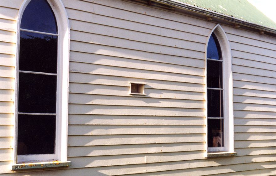 A close up of a gunport at the Scottish Kirk in Tangimoana. The Scottish Kirk was constructed in Parewanui, near Bulls by Presbyterian settlers from Scotland in 1862. In addition to doubled skin walls, gun portals were also incorporated on two sides of the church in order to provide protection due to tensions in the area. In 1868 the church was relocated to higher ground and at the turn of the century, the building was moved to more accessible ground on Parewanui Road. In 1962, falling attendance numbers prompted its relocated to Tangimoana. In 2000 the building was relocated from Tangimoana to Waikanae, where it serves as St Andrew's Church hall.