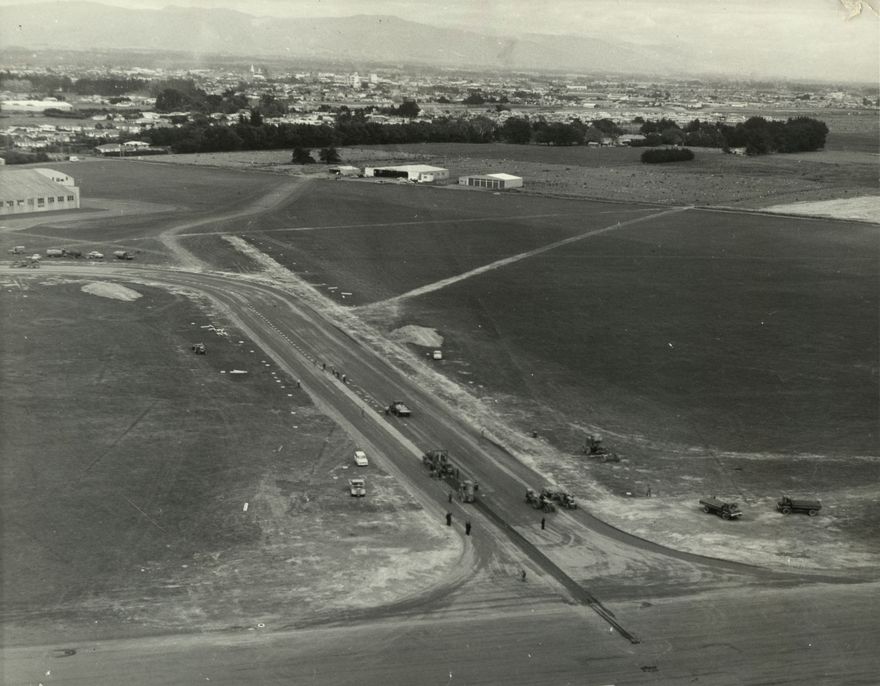 Aerial view of machinery working on the runway. Beyond can be seen the city of Palmerston North.