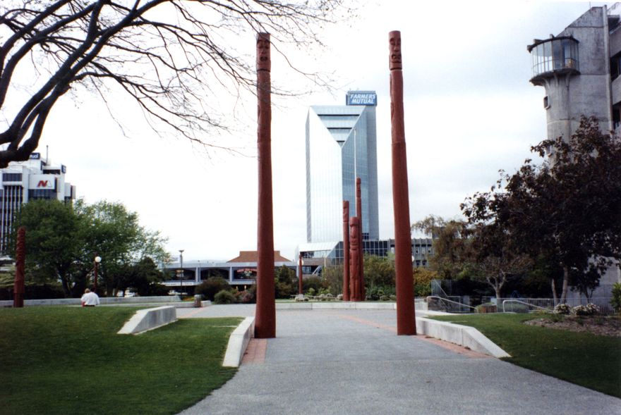 These carvings, created by John Bevan Ford and Warren Warbrick were constructed in 1990 to honour the significance of the Māori name for The Square, Te Marae o Hine, The Courtyard of the Daughter of Peace. John Bevan Ford, a member of Ngāti Raukawa and a well known artist of Palmerston North was commissioned to undertake the work by the Rangitāne Maori Committee and the Palmerston North City Council. The paved courtyard provided a venue for civic gatherings where Māori protocol could be used and the set of nine wooden carvings defined the boundaries of the courtyard. The two large posts shown here contain carvings which face in two directions. The outward carvings welcome visitors to the city by Rangitāne, while the inward carvings depict Te Rongorito and her mother Hineaupounamu, bring their gifts of peace to the civic gathering place which they overlook. The group of three carved posts, shown in this picture symbolise a hope for peace and prosperity. The Square has since been redesigned but the carving and their significance remain.
